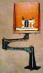 York. Arm engraved "Patented Feb 15, 1881". Mounted on wooden base